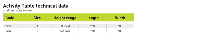 Our Activity table is an ideal table for younger children at nursery, school and home. The steel legs can be adjusted in height to ensure good seating posture for your child and can easily be folded for storage.