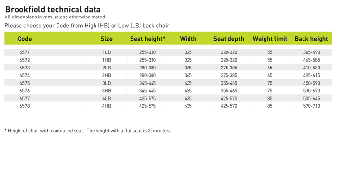 The Brookfield comes complete with a moulded back, contoured seat, pelvic strap and height adjustable arms as standard. A static or mobile version is also available as well as a choice of high or low back.