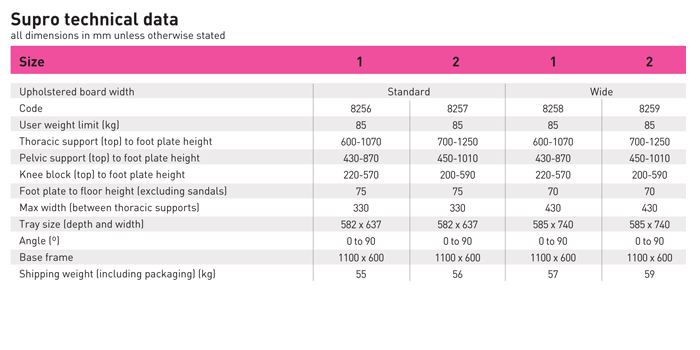 Supro is available in a choice of two widths and comes with upholstered board, lateral and pelvic supports, knee cups, cocoon sandals and tray as standard.